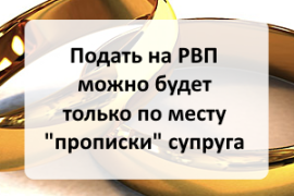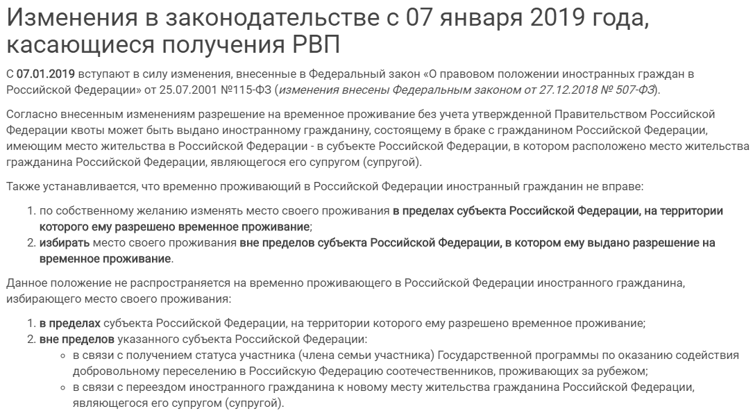 19.12.2018 в третьем чтении был принят проект изменений в Федеральный закон от 25.07.2002 г. № 115-ФЗ "О правовом положении иностранных граждан в Российской Федерации", который обяжет иностранных граждан и лиц без гражданства, подающих на РВП без учета квоты на основании брака с гражданином(кой) РФ, обращаться с заявлением в территориальный орган по вопросам миграции того субъекта РФ, в котором зарегистрирован(а) по месту жительства супруг(а) - гражданин(ка) РФ.