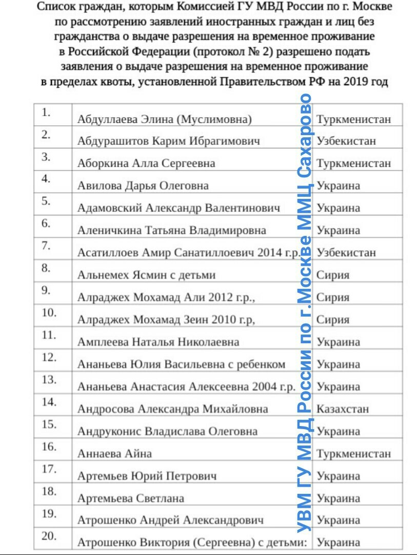 Если вы нашли свою фамилию в списке граждан , получивших квоту для полученияРВП на 2019 на 2019 год обращайтесь влюбой из центров МВП для полученияполного пакета документов и заполнение заявлений по ценам в 2-3 раза ниже чем в ММЦ Сахарово