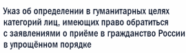 1. Установить, что лица, постоянно проживающие на территориях отдельных районов Донецкой и Луганской областей Украины, имеют право обратиться с заявлениями о приеме в гражданство Российской Федерации в упрощенном порядке в соответствии с частью восьмой статьи 14 Федерального закона от 31 мая 2002 г. № 62‑ФЗ «О гражданстве Российской Федерации».