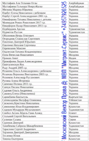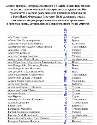Если вы нашли свою фамилию в списке граждан , получивших квоту для полученияРВП на 2019 на 2019 год обращайтесь влюбой из центров МВП для полученияполного пакета документов и заполнение заявлений по ценам в 2-3 раза ниже чем в ММЦ Сахарово