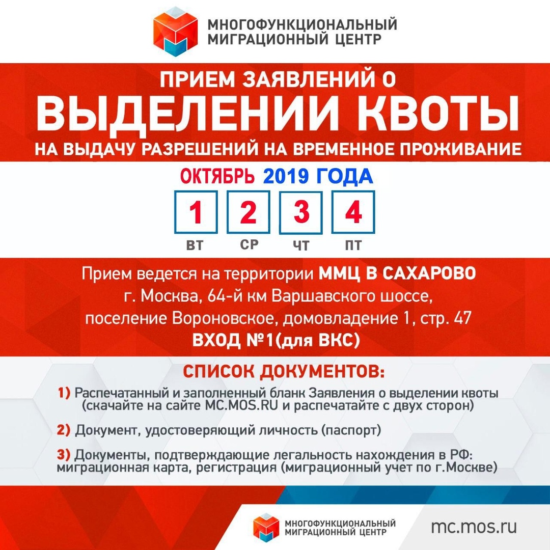 ПРИЁМ ЗАЯВЛЕНИЙ НА КВОТУ ДЛЯ РВП В МОСКВЕ НА ОКТЯБРЬ 2019 Г.