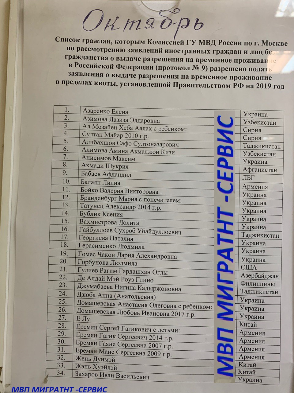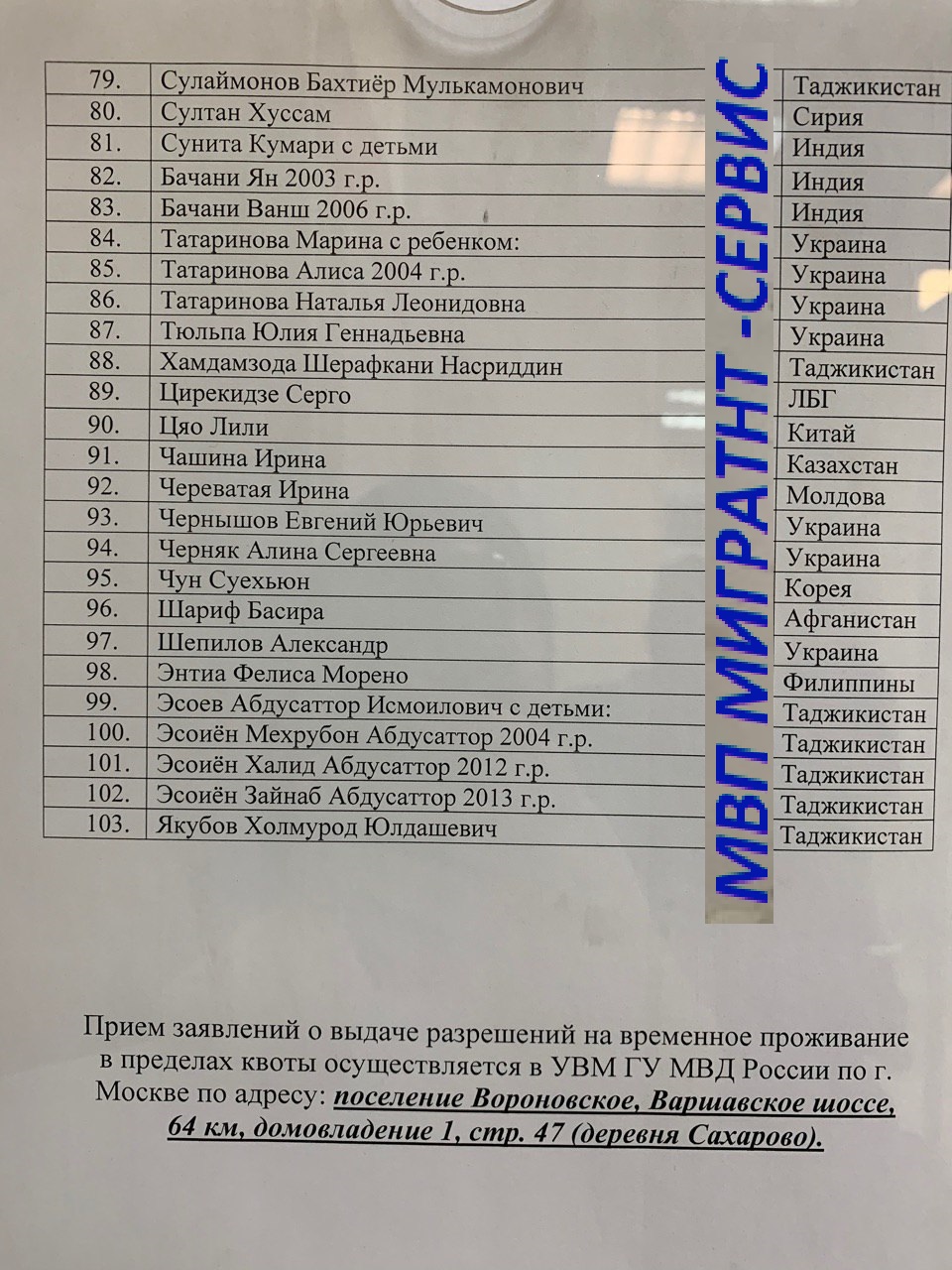 Если вы нашли свою фамилию в списке граждан , получивших квоту для полученияРВП на 2019 вы можете заказать бесплатную консультацию юртста для полученияполного пакета документов и заполнение заявлений .