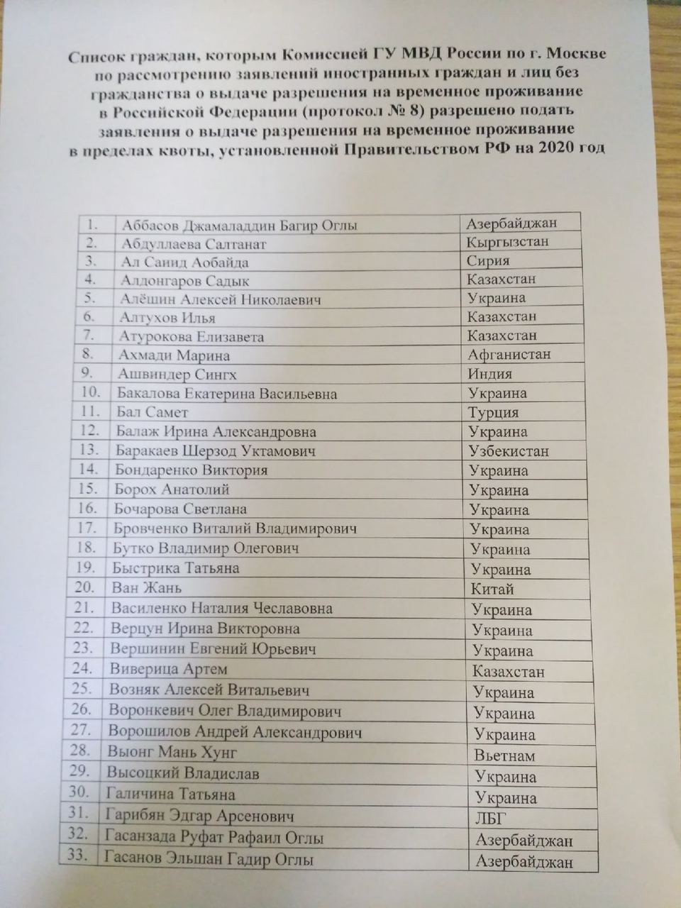 СПИСОК ПОЛУЧИВШИХ КВОТУ НА РВП в августе 2020 года